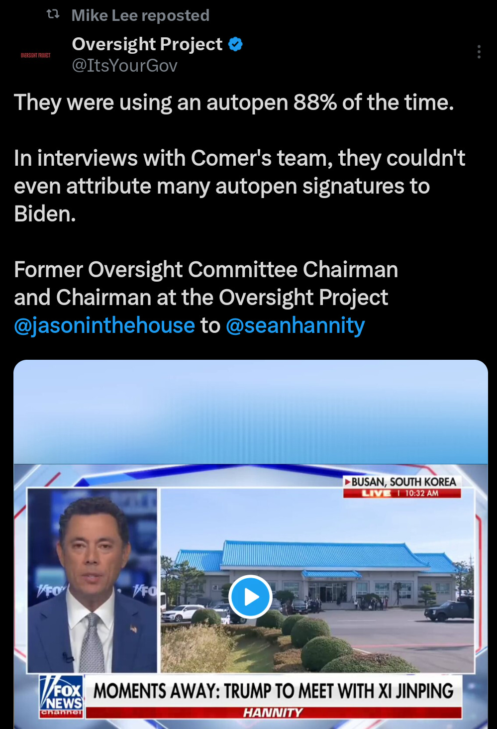 Playback speed×Share postShare post at current timeShare from 0:000:00/0:00228Biden Admin were using autopen 88% of the time! Almost nothing can be attributed to Senile BidenFeb 15, 2026228ShareThey were using an autopen 88% of the time.In interviews with Comer’s team, they couldn’t even attribute many autopen signatures to Biden.Former Oversight Committee Chairman and Chairman at the Oversight ProjectBased Mike Lee Fan is a reader-supported publication. To receive new posts and support my work, consider becoming a free or paid subscriber.SubscribeDiscussion about this videoCommentsRestacksBased Mike Lee FanSubscribeRecent PostsHORRIFIC: Cartels lured in pregnant womenMar 18Mike Lee is FULLY on board with the 2nd Amendment Mar 4Democrats are completely flabbergasted that immigrants ALSO PREFER SAFER CITIES!Feb 25Time to end Biden's weaponization of the justice systemFeb 5Leftists have a weird infatuation with murd*r and assass*nationsJan 30Creepy Commie White Woman Believes White People Shouldn’t be Allowed to Own HousesJan 26Leftists can no longer hide its political violenceJan 22